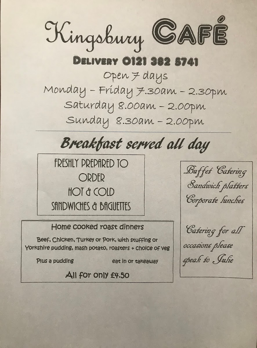 Kingsbury Cafe Menu